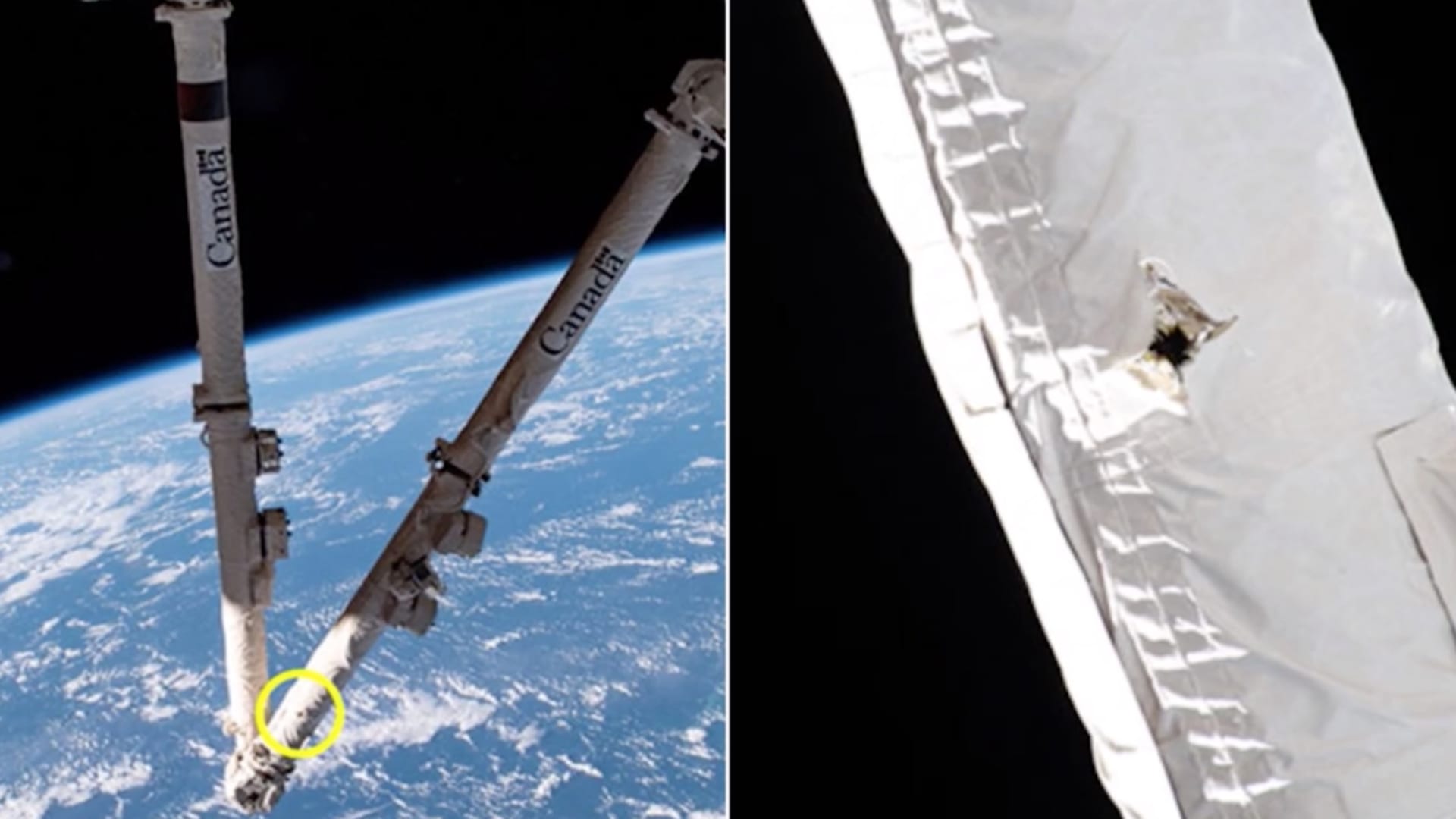 اصطدمت خردة فضائية بمحطة الفضاء الدولية، مما أدى إلى إتلاف ذراع آلية. لاحظت فرق من الوكالة الكندية وناسا الضرر لأول مرة خلال عملية تفتيش روتينية في 12 مايو/حزيران. ولكن وكالة الفضاء الكندية تقول إنها لا تزال تعمل. في حين أنه من غير الواضح، الجسم الذي أصاب الذراع.