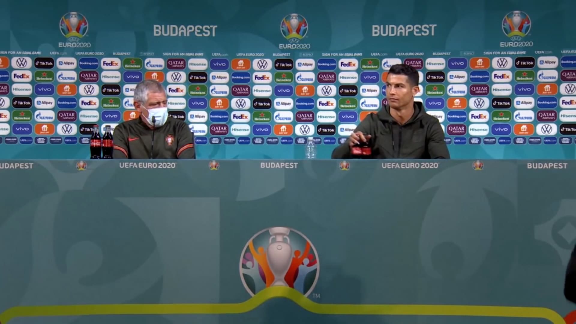تصدرت لحظة خارج الملعب لنجم منتخب البرتغال، كريستيانو رونالدو، عناوين الصحف في وقت مبكر، الثلاثاء، حيث ظهر رونالدو وهو يزيح قنينتي كوكا كولا من الطاولة أثناء مؤتمر صحفي، وطلب من الناس شرب الماء بدلًا من ذلك.