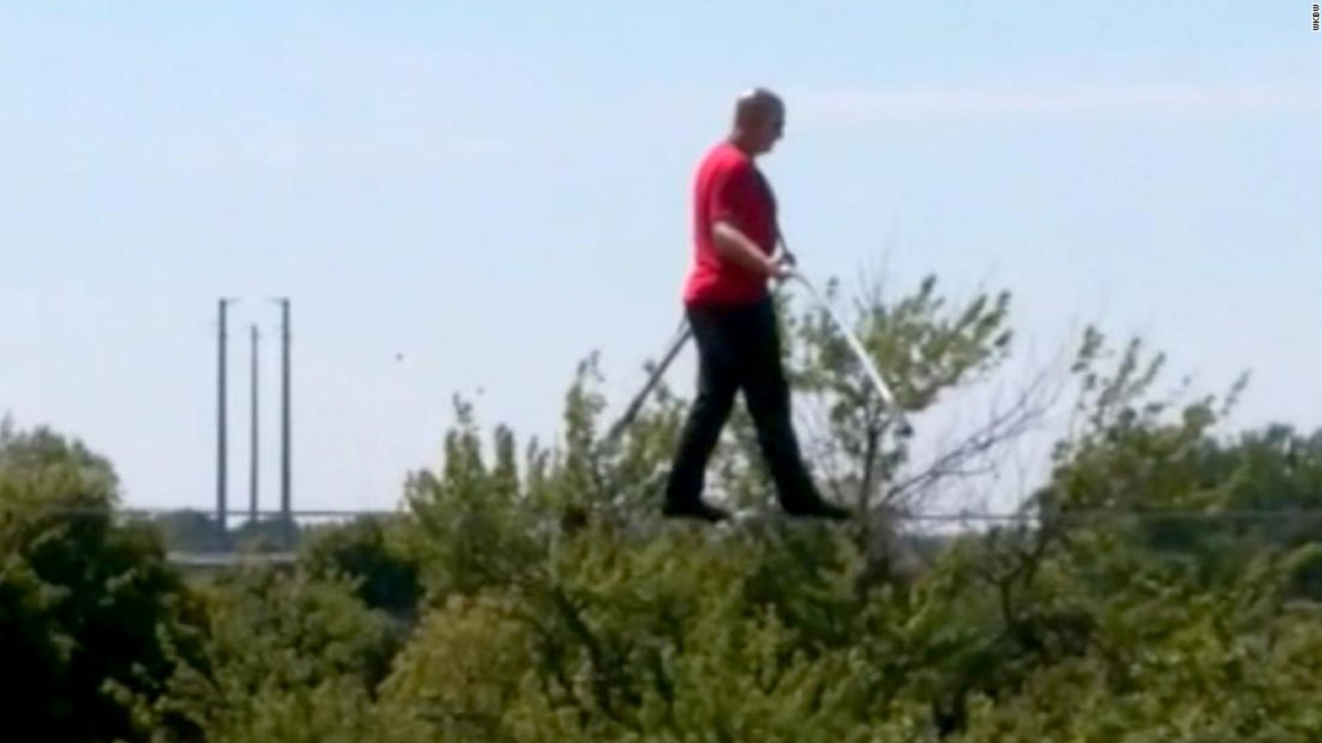 سار المغامر المتهور، نيك واليندا على سلك رفيع بطول 320 قدمًا وعلى ارتفاع شاهق، جاء خلال حدث في حرم كلية ديوفيل في بوفالو، نيويورك.