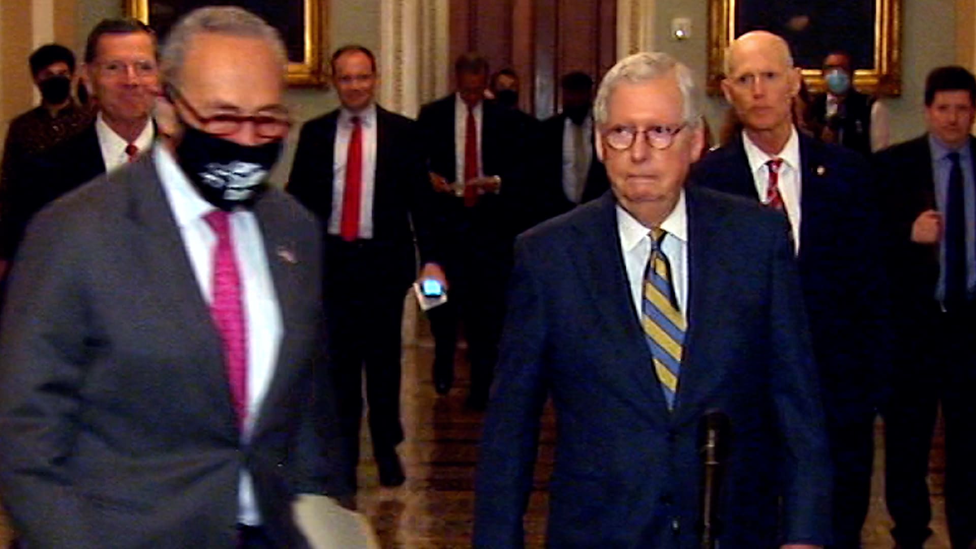 شومر يقفز أمام ماكونيل ويقطع الطريق عليه قبيل مؤتمر صحفي.. شاهد رد فعله
