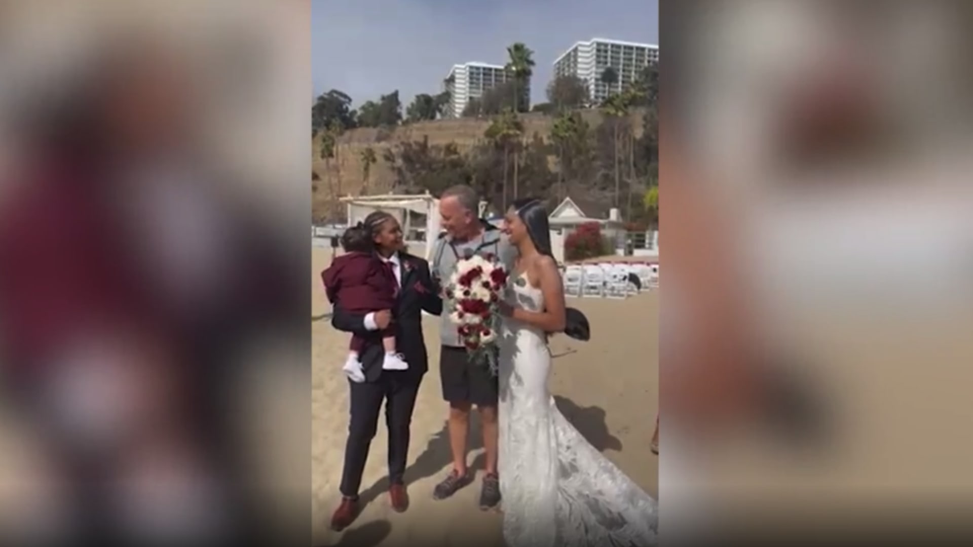 بعد اكتشافه وجود حفل زفاف على شاطئ سانتا مونيكا بولاية كاليفورنيا، قرر الممثل الشهير توم هانكس تهنئة العروسين بشكل شخصي وعلى طريقته الخاصة.