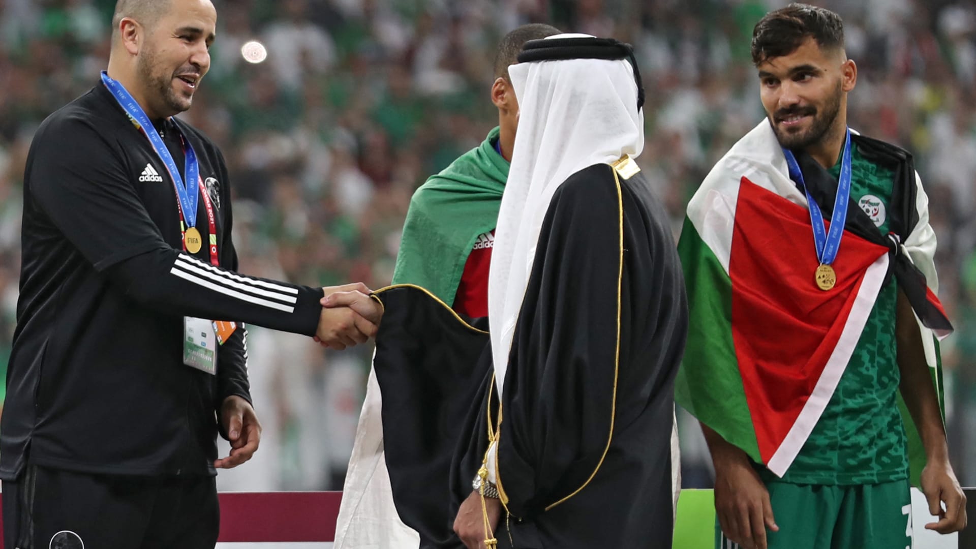 شبيه السيسي وأمير قطر يمازح مدرب الجزائر.. مشهدان طريفان في اليوم الختامي لكأس العرب