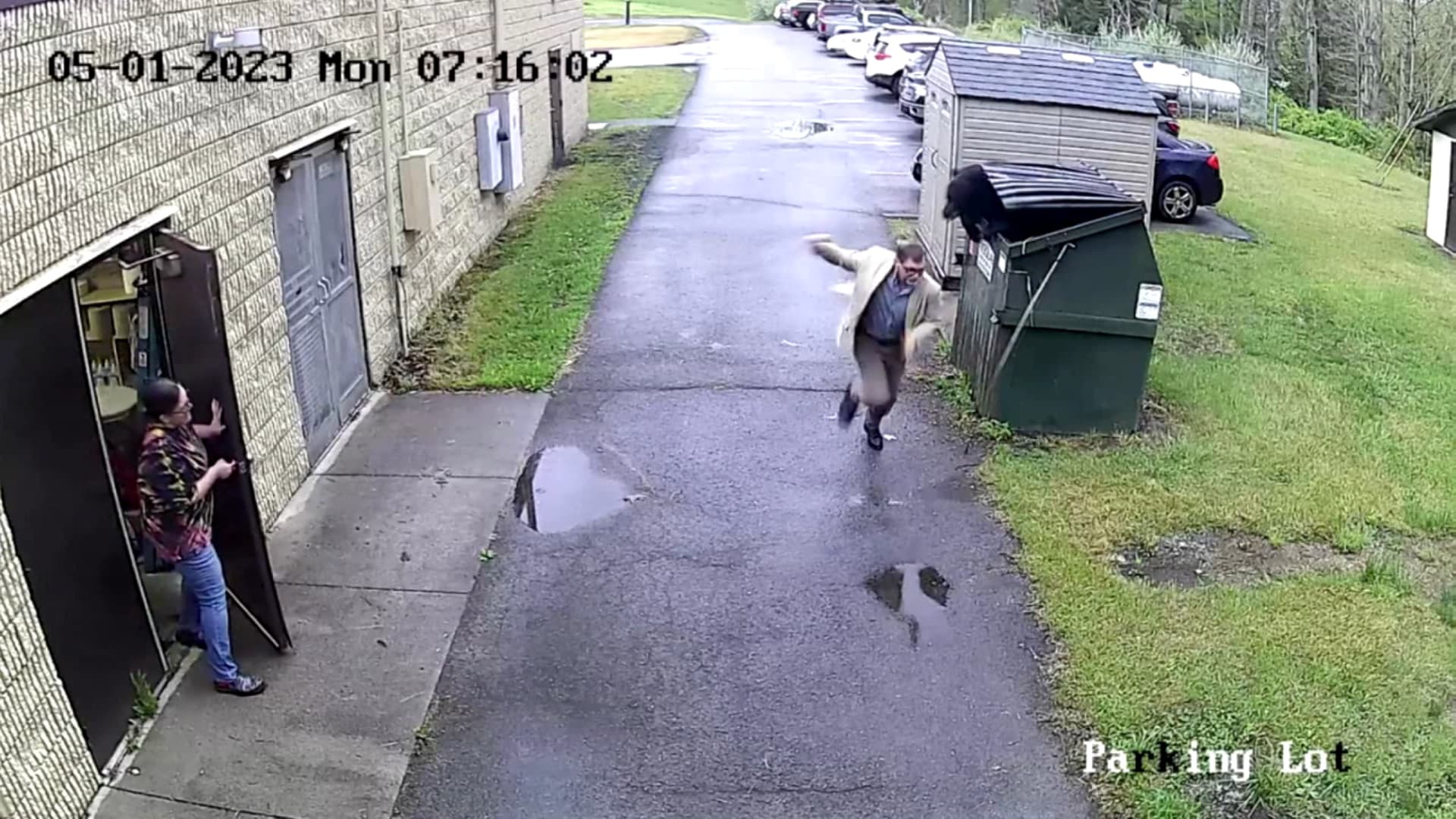 قام جيمس مارش مدير مدرسة “زيلا” الابتدائية في مقاطعة نيكولاس بولاية فيرجينيا الغربية بفتح حاوية قمامة وقد أصيب هو وموظفة أخرى بالمدرسة بصدمة كبيرة عندما ظهر الدب الغارق في القمامة وقفز باتجاهه.