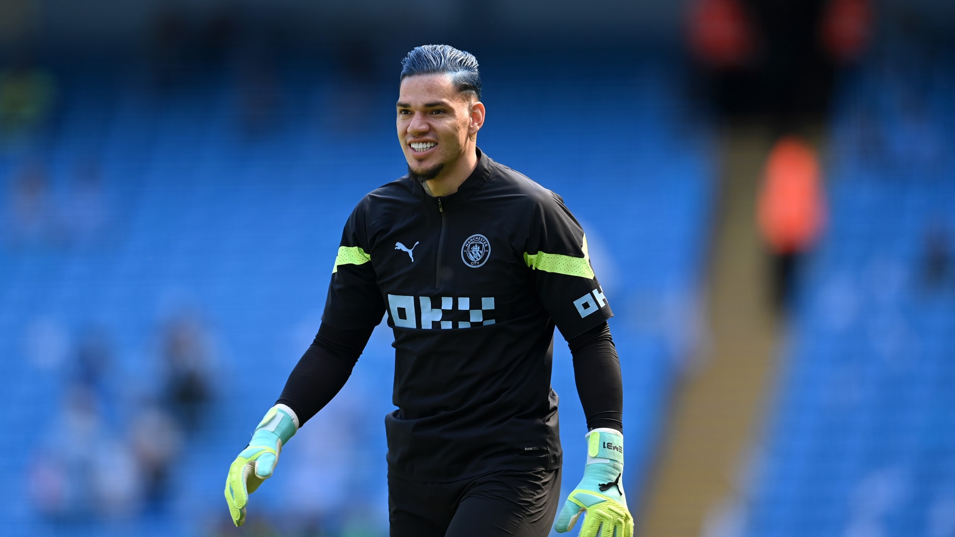 صبغ الحارس البرازيلي شعره باللون الأزرق احتفالاً بفوز فريق “السيتيسينز” بلقب البريميرليغ لموسم 2023/2022.