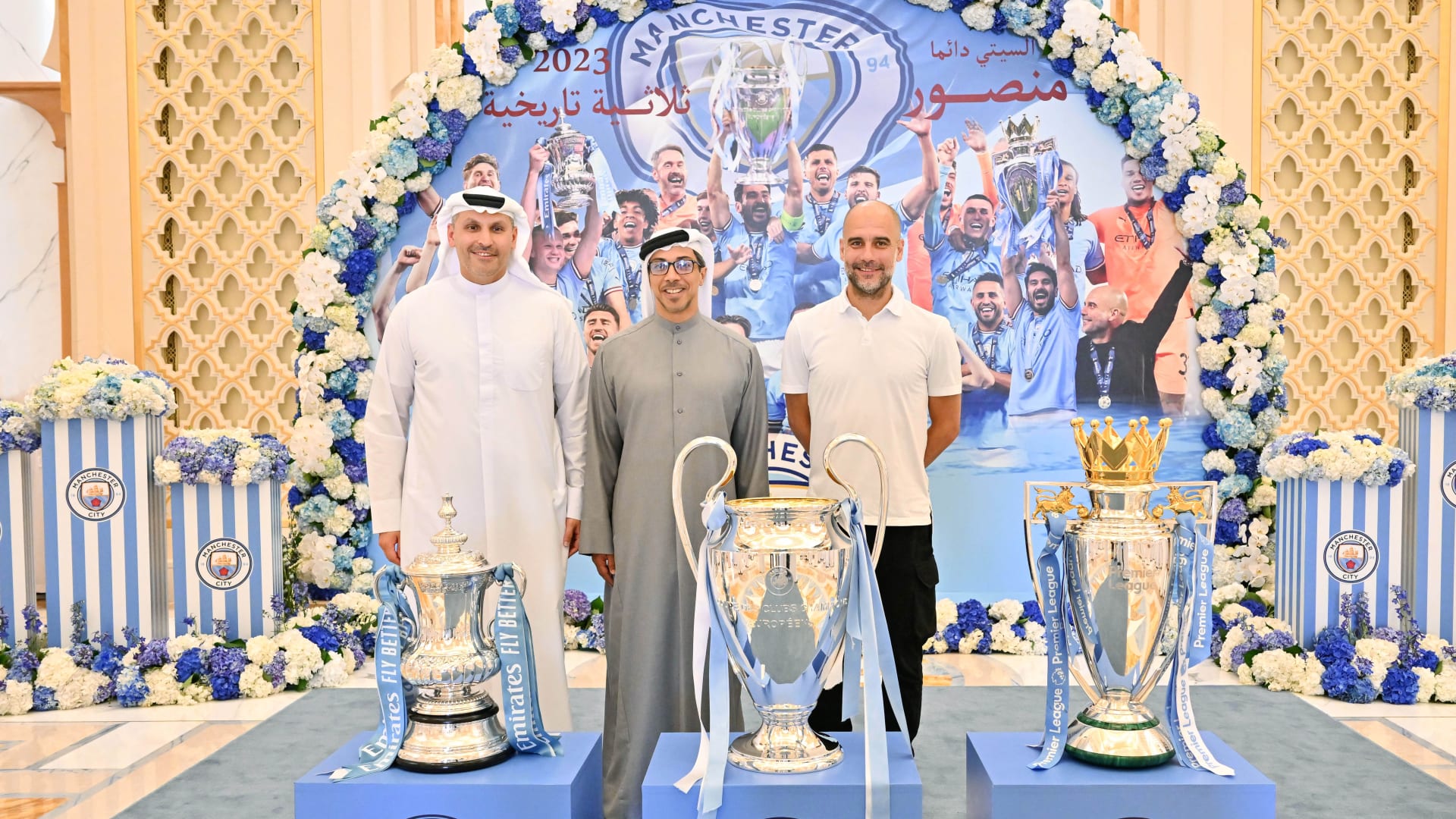 بعد الفوز بالثلاثية.. منصور بن زايد يستقبل رئيس مانشستر سيتي وبيب غوارديولا