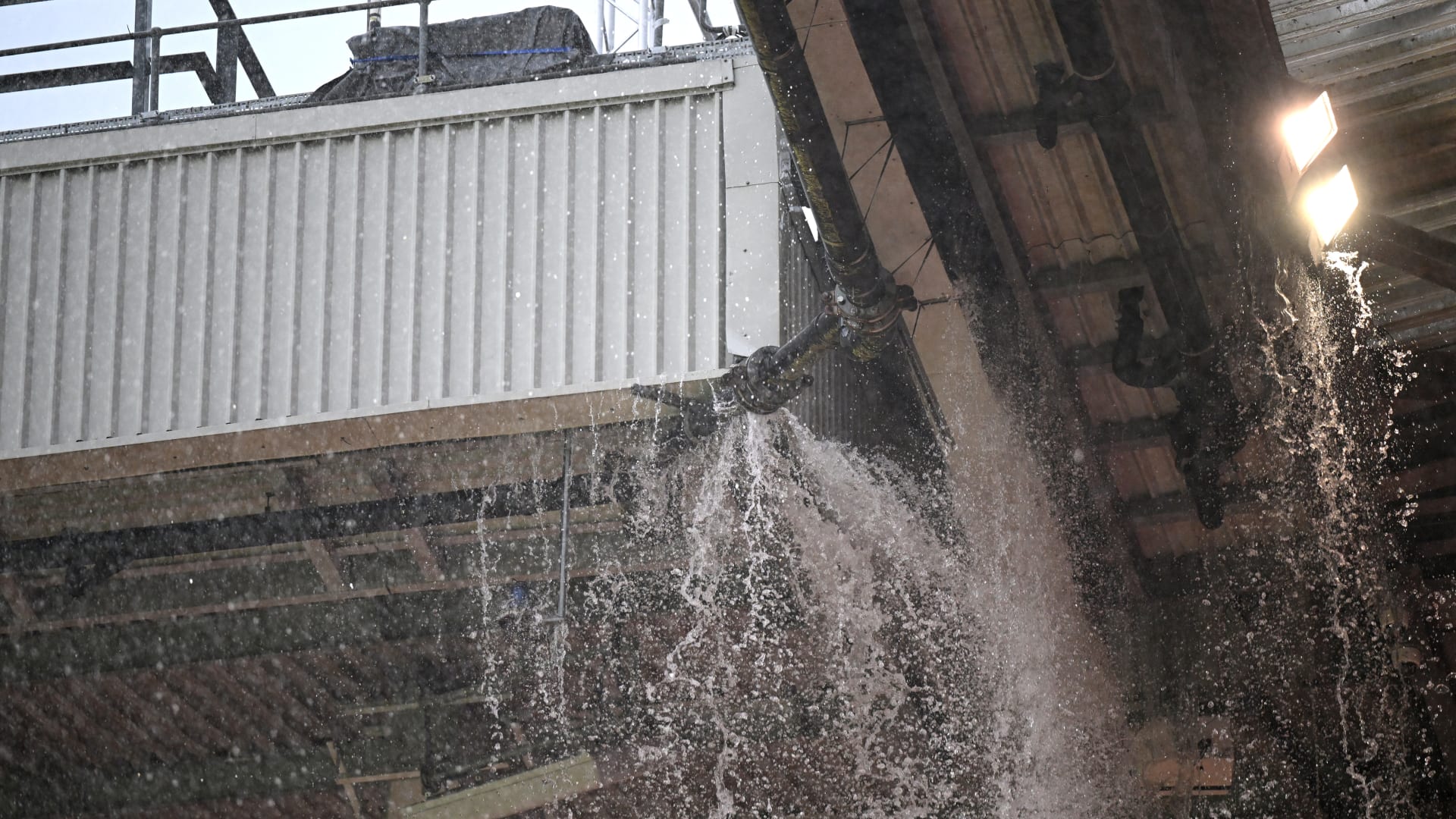 وتداول رواد المنصة مقاطع فيديو وصورا تُظهر تدفق المياه بشكل كبير من سقف الملعب.