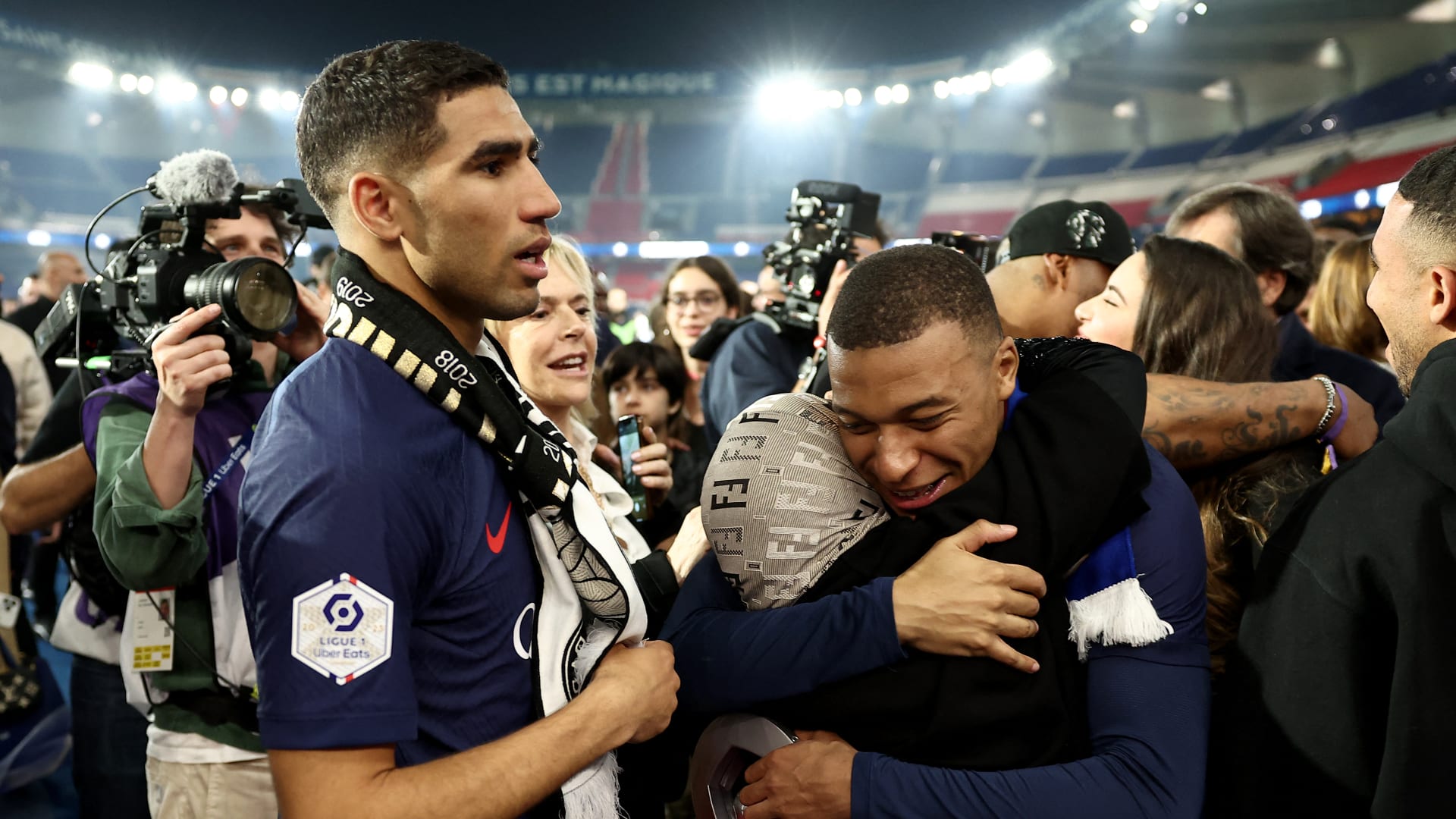 وخلال الاحتفال، حرصت والدة اللاعب أشرف حكيمي على وداع كيليان مبابي، الذي قرر الرحيل عن نادي باريس سان جيرمان بعد أن قضى 7 سنوات معه.