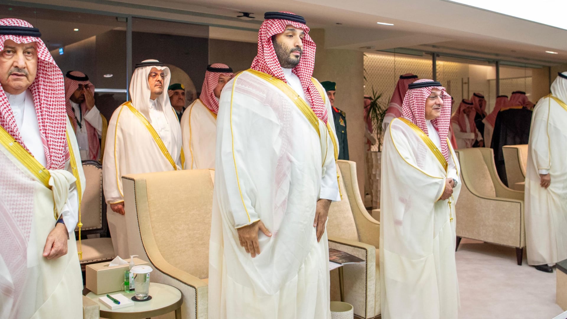 وأبرز نشطاء لقطات من رد فعل الجمهور بمقابلة المنصة حيث وقف الأمير محمد بن سلمان وإعطاء ظهرهم للملعب في حين ذهب آخرون لتداول لحظة دخوله منصة الشرف في الملعب في الوقت الذي لفت فيه نشطاء إلى “الهيبة” التي تلف ولي العهد السعودي عند دخوله الملعب.