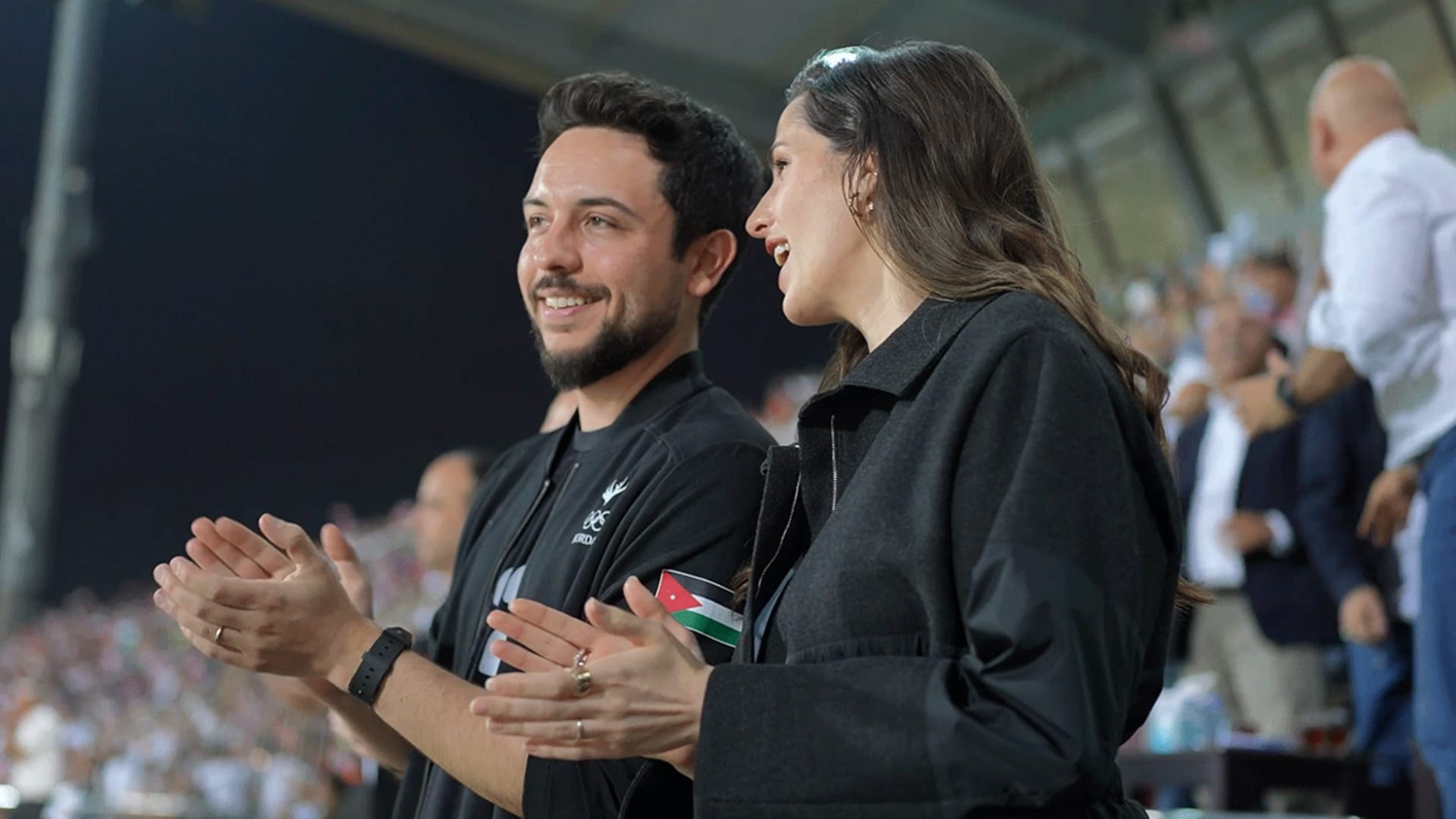 ويظهر في مقطع الفيديو المتداول هتاف أحد الحضور: “ستي رجوة الله يخليك.. سيدي حسين طاير فيك”، وظهور ابتسامة من الأميرة رجوة والأمير الحسين على ذلك.