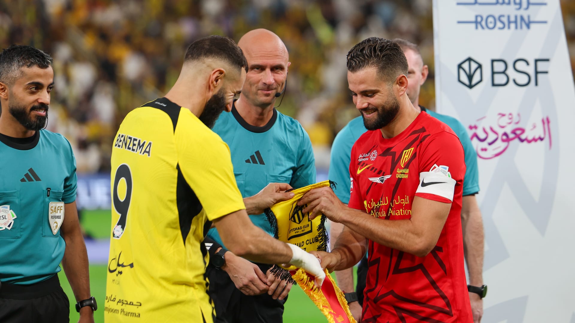 قبل صافرة البداية وفي ممر ملعب مدينة الملك عبد الله الرياضية (الجوهرة المشعة)، التقى بنزيما بزميله السابق في ريال مدريد الإسباني، ناتشو، إذ حرص على معانقته والتحدث معه.