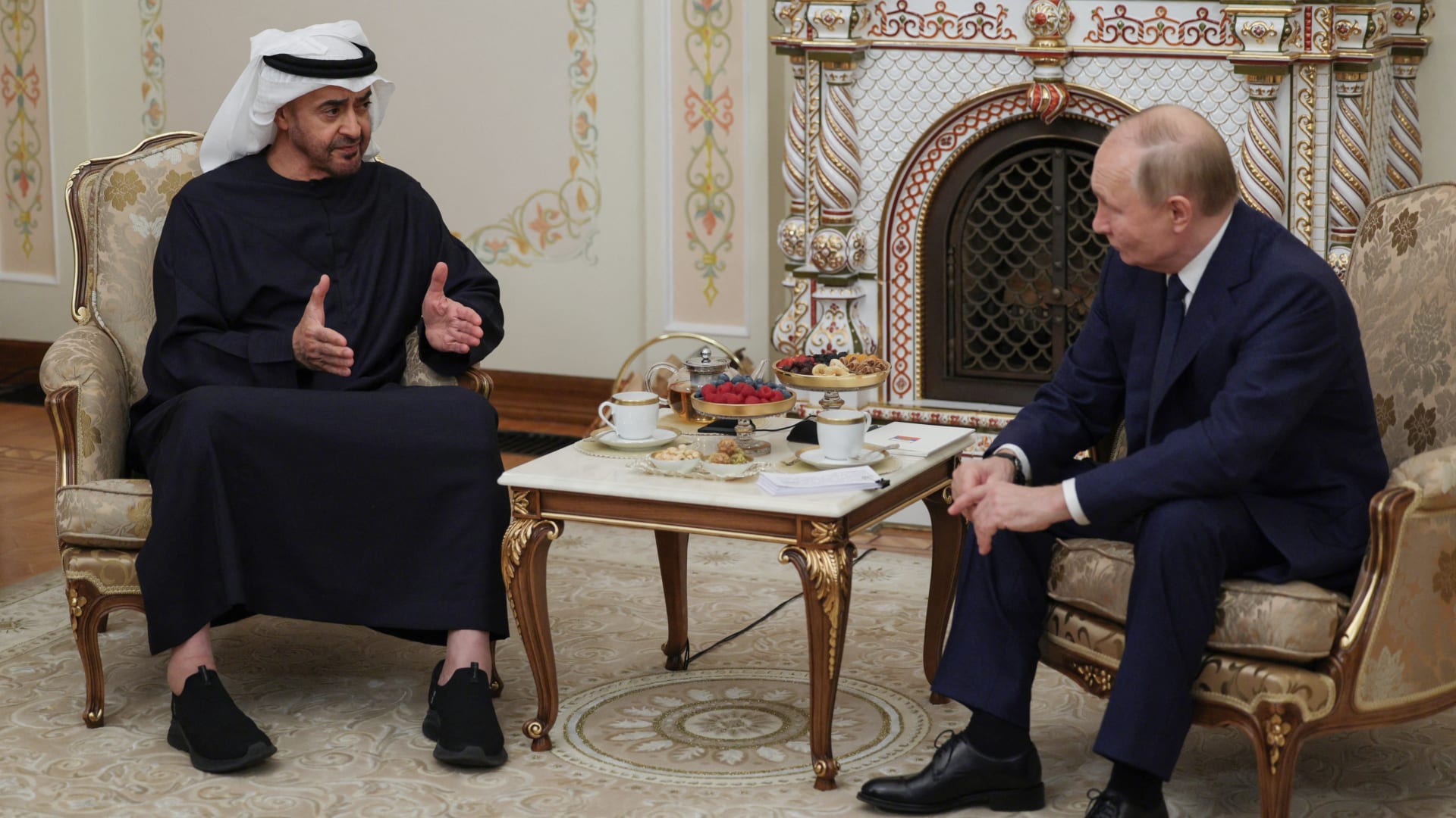 ثمن حذاء محمد بن زايد بلقاء مع بوتين يثير تفاعل وسائل إعلام روسية وسط تعليقات مغردين