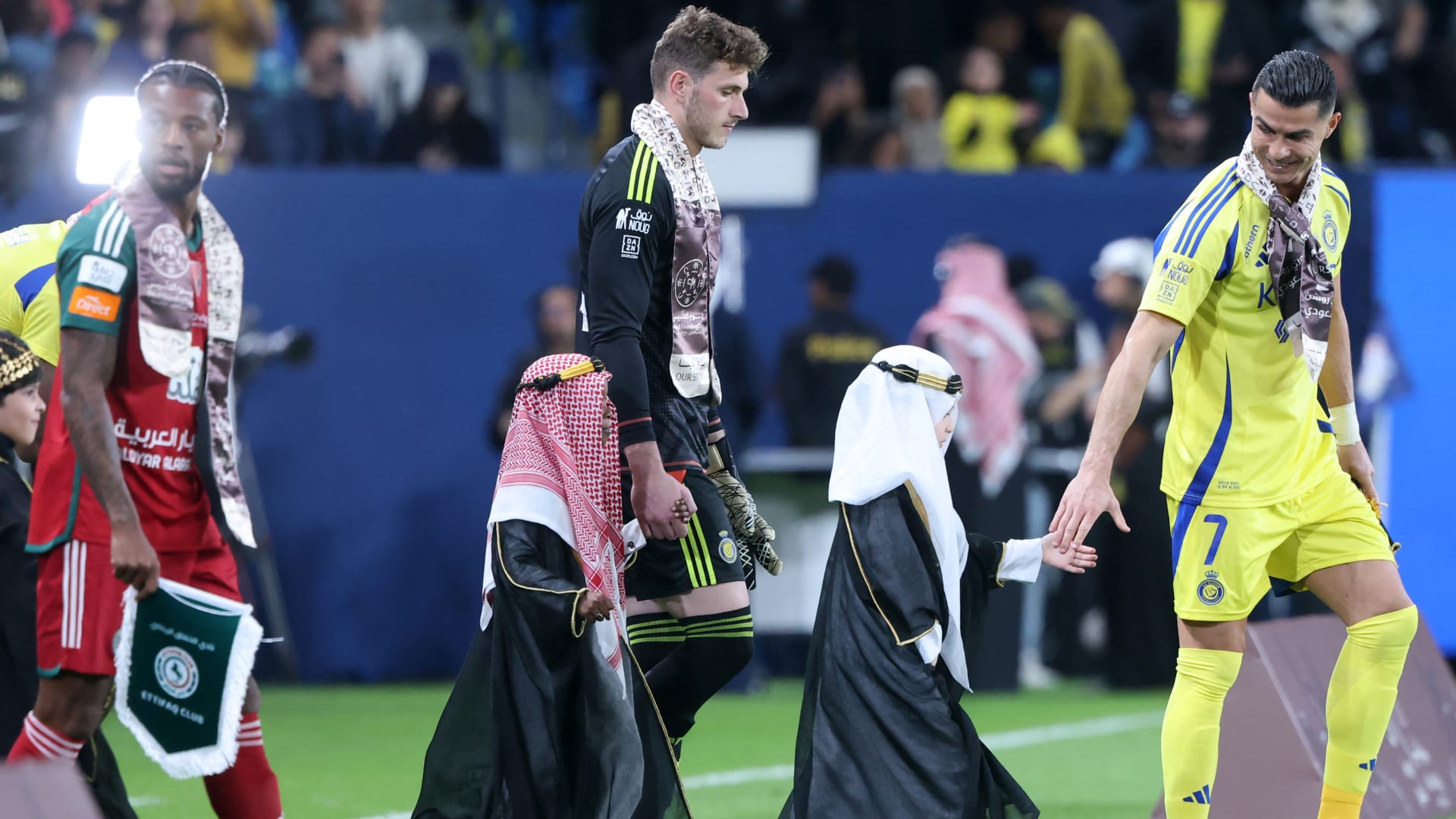 دبي، الإمارات العربية المتحدة (CNN) — تداول مستخدمون لمنصة “إكس” (تويتر سابقاً) لقطات مصورة تظهر ما فعله النجم البرتغالي كريستيانو رونالدو مع أطفال يرتدون الزي السعودي.