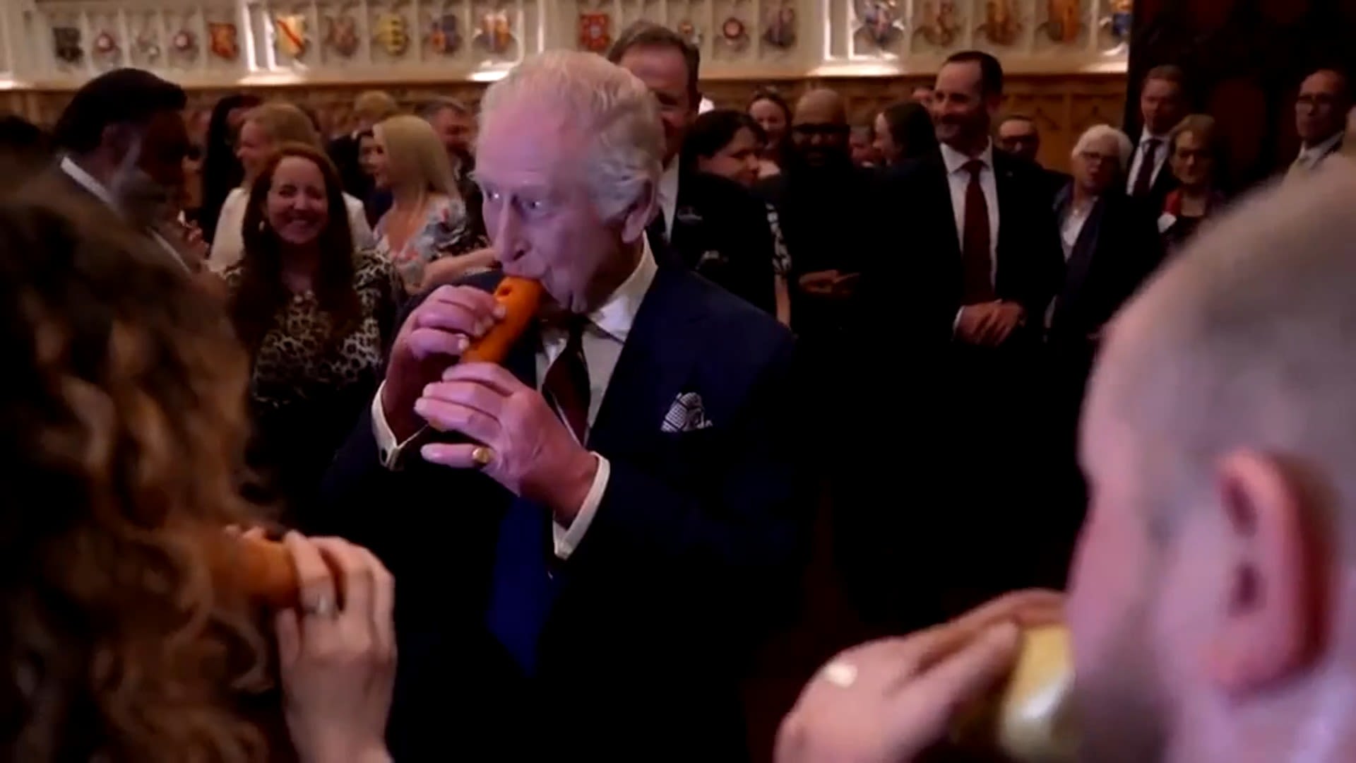 التقطت الكاميرات مشهدًا فريدًا، يظهر فيه العاهل البريطاني، الملك تشارلز وهو يعزف على جزرة منحوتة كآلة “ريكوردر” خلال زيارة لحفل “أوركسترا لندن للخضراوات” يوم الخميس في قلعة وندسور.