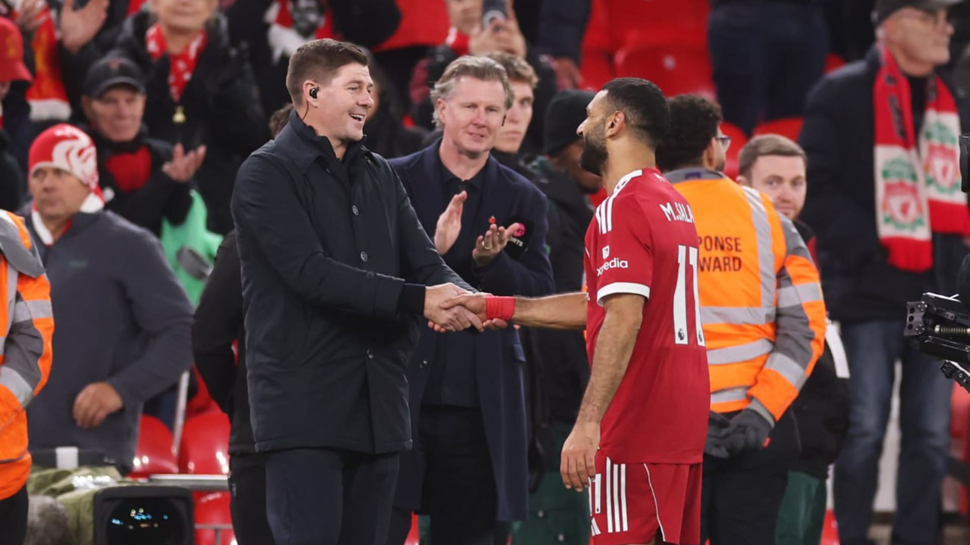 عقب صافرة النهاية، توجه محمد صلاح نحو نجم نادي ليفربول السابق، ستيفن جيرارد، الّذي كان متواجداً على خط الملعب خلال ممارسته لعمله كمحلل فني لشبكة “TNT Sports”…