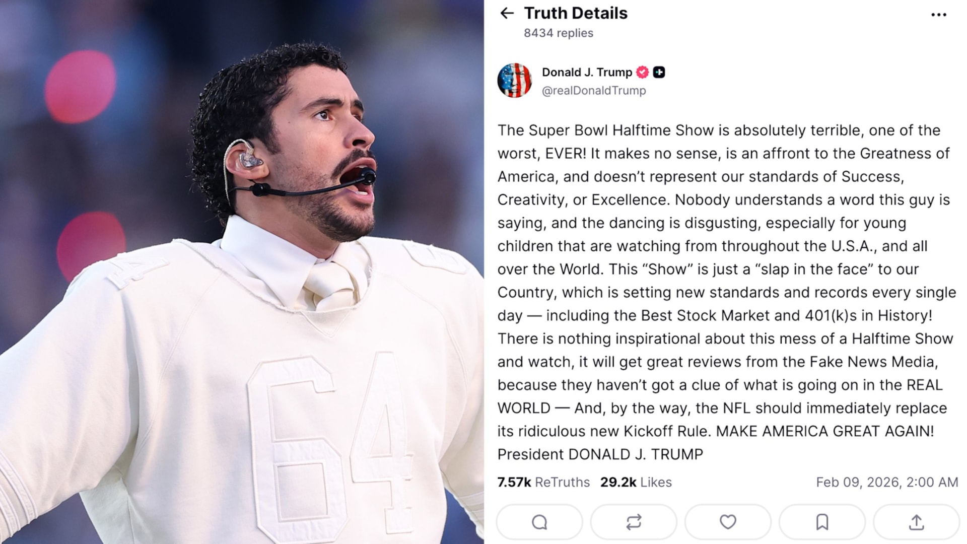 علّق الرئيس الأمريكي دونالد ترامب على عرض باد باني في استراحة مباراة السوبر بول، واصفًا إياه بأنه “فظيع للغاية” ومن أسوأ العروض، وفق ما نشره على منصته “تروث سوشيال”.